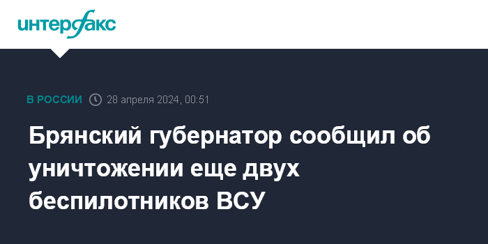 Москва. 28 апреля. INTERFAX.RU - Губернатор Брянской области Александр Богомаз сообщил в ночь на воскресенье о пресечении еще одной атаки ВСУ с помощью беспилотников самолетного типа.