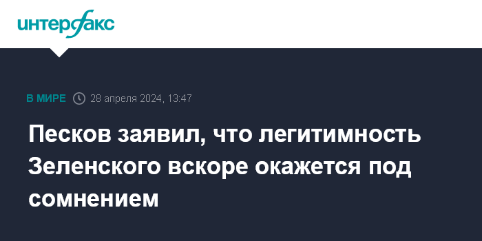 Москва. 28 апреля. INTERFAX.RU - В Кремле считают, что в скором времени легитимность президента Украины Владимира Зеленского будет поставлена под сомнение, в том числе на Украине.