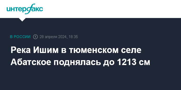 Москва. 28 апреля. INTERFAX.RU - Уровень воды в реке Ишим в селе Абатском (райцентр Абатского района) Тюменской области продолжает повышаться, сообщает информационный центр регионального правительства в воскресенье.
