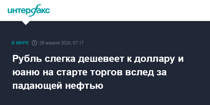 Москва. 29 апреля. INTERFAX.RU - Доллар США и юань слегка подрастают на Московской бирже на старте торгов в понедельник, рубль немного дешевеет в основных валютных парах вслед за падающей нефтью.