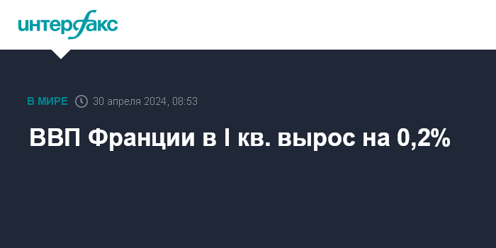 Москва. 30 апреля. INTERFAX.RU - Объем ВВП Франции в первом квартале увеличился на 0,2% по сравнению с предыдущими тремя месяцами, говорится в предварительном отчете национального статистического института Insee.