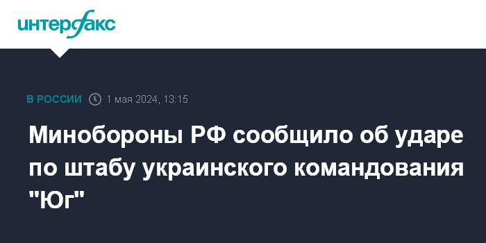 Москва. 1 мая. INTERFAX.RU - Нанесен удар по штабу оперативного командования "Юг" армии Украины, сообщило министерство обороны России в среду.
