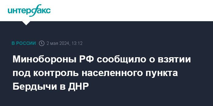 Москва. 2 мая. INTERFAX.RU - Российские военнослужащие взяли под контроль населенный пункт Бердычи в Донецкой народной республике, сообщило министерство обороны РФ в четверг.