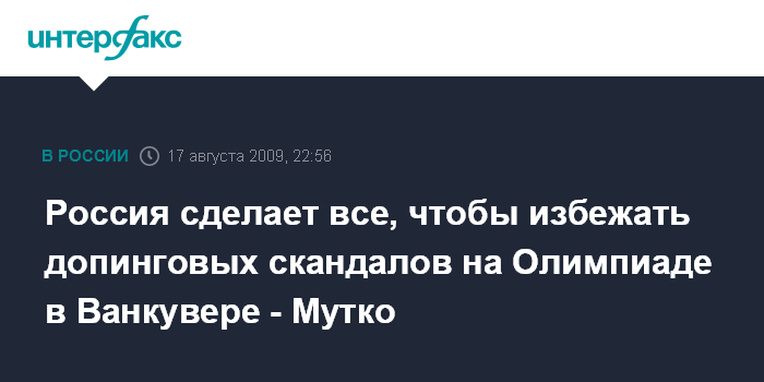 Москва. 17 августа. ИНТЕРФАКС - Министр спорта, туризма и молодежной политики Виталий Мутко заявляет, что российская сторона сделает все возможное, чтобы избежать допинговых скандалов со своими спортсменами на зимней Олимпиаде в Ванкувере.