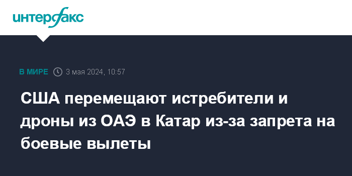 Москва. 3 мая. INTERFAX.RU - США вынуждены передислоцировать истребители, БПЛА и другую авиацию из ОАЭ в Катар в связи с решением Абу-Даби ввести ограничения на боевые миссии американских военных с территории Эмиратов, сообщает в пятницу The Wall Street Journal (WSJ) со ссылкой на источник.