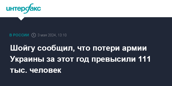 "Соединенные Штаты Америки и их союзники требуют от Украины не допустить развала обороны и любой ценой сдерживать наступление российских войск. В результате ежесуточные потери противника в апреле возросли до тысячи военнослужащих. Всего за этот год они превысили 111 тысяч человек, двадцать одну тысячу единиц вооружения и военной техники", - сказал Шойгу на селекторном совещании с руководящим составом Вооружённых сил РФ в пятницу.
