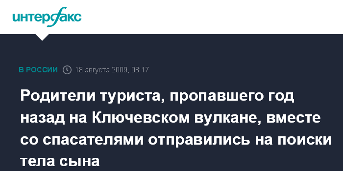 Москва. 18 августа. INTERFAX.RU - Родители туриста, пропавшего прошлой осенью на Ключевском вулкане, прилетели на Камчатку из Челябинска, чтобы вместе со спасателями продолжить поиск тела сына.