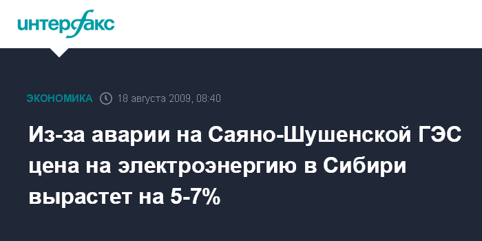 Из-за аварии на Саяно-Шушенской ГЭС цена на электроэнергию в Сибири вырастет на 5-7%