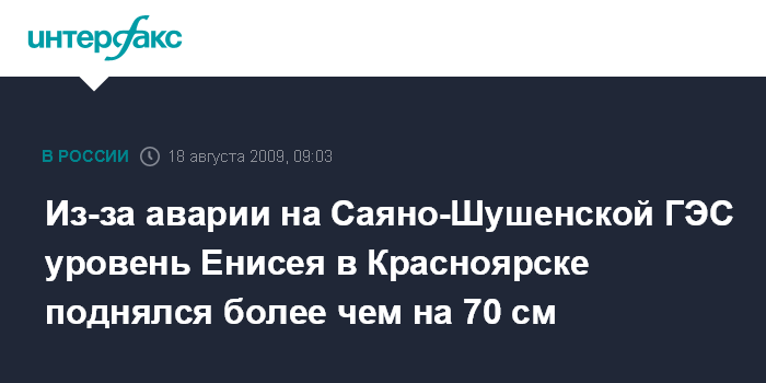 Москва. 18 августа. INTERFAX.RU - Уровень воды в Енисее в районе Красноярска за сутки, прошедшие после аварии на Саяно-Шушенской ГЭС, поднялся на 73 см.