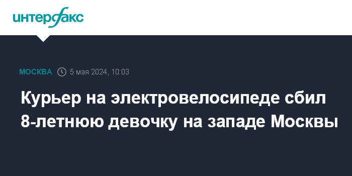 Москва. 5 мая. INTERFAX.RU - В субботу, 4 мая, во дворе жилого дома на ул. Ярцевская в Москве водитель электровелосипеда службы доставки сбил ребенка и покинул место происшествия. Как сообщает прокуратура столицы, 8-летняя девочка доставлена в больницу.