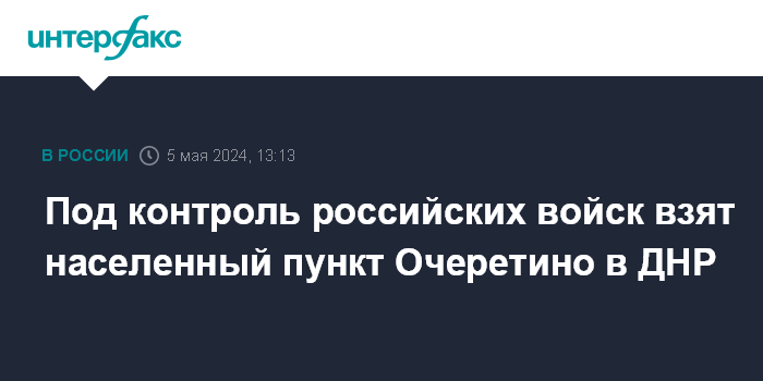 Москва. 5 мая. INTERFAX.RU - Российские войска взяли под полный контроль поселок Очеретино Донецкой народной республики (ДНР), заявили в воскресенье в Минобороны РФ.