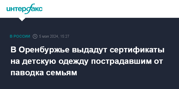 Москва. 5 мая. INTERFAX.RU - Власти Оренбургской области выдадут сертификаты на приобретение одежды для всех детей из семей, пострадавших в результате масштабного паводка этой весной, сообщил губернатор региона Денис Паслер.