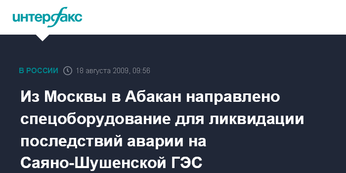 Из Москвы в Абакан направлено спецоборудование для ликвидации последствий аварии на Саяно-Шушенской ГЭС