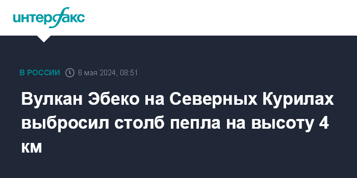 Москва. 6 мая. INTERFAX.RU - Вулкан Эбеко, расположенный на северокурильском острове Парамушир, во второй половине дня в понедельник выбросил столб пепла на высоту 4 км над уровнем моря. Об этом сообщил Камчатский филиал Единой Геофизической службы РАН в своем телеграм-канале.