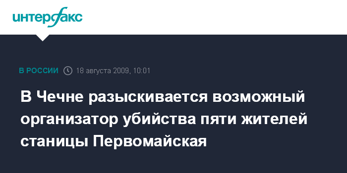 Москва. 18 августа. INTERFAX.RU - Предположительно, известна личность боевика, который мог быть причастен к совершению убийства пяти человек в станице Первомайская Грозненского района Чечни, сообщил агентству "Интерфакс-Юг" источник в штабе Объединенной группировки войск на Северном Кавказе.