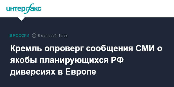 Москва. 6 мая. INTERFAX.RU - Пресс-секретарь президента РФ Дмитрий Песков назвал очередными голословными обвинениями сообщения западных СМИ о том, что, по мнению европейских разведслужб, Россия якобы планирует целый ряд диверсий и актов саботажа в Европе.