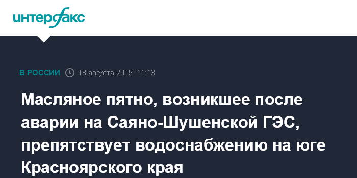 Москва. 18 августа. INTERFAX.RU - В Шушенском районе Красноярского края временно остановлена работа водозаборных сооружений из-за угрозы проникновения в систему водоснабжения остатков масляного пятна, распространяющегося по Енисею после аварии на Саяно-Шушенской ГЭС (СШГЭС).