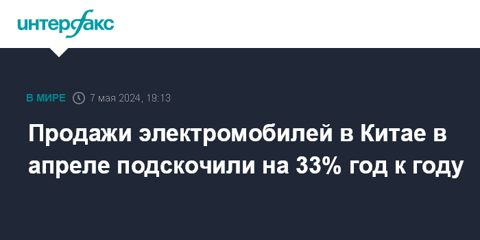 Москва. 7 мая. INTERFAX.RU - Розничные продажи электромобилей в Китае в апреле выросли на 33% в годовом выражении, до 800 тыс., говорится в отчете Китайской ассоциации пассажирских автомобилей (China Passenger Car Association, CPCA).