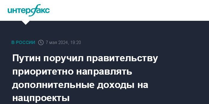 Москва. 7 мая. INTERFAX.RU - Правительство РФ должно обеспечить направление в приоритетном порядке дополнительных доходов федерального бюджета, которые формируются в процессе его исполнения, на реализацию национальных целей. Такое поручение содержится в указе "О национальных целях развития Российской Федерации на период до 2030 года и на перспективу до 2036 года", подписанном президентом Владимиром Путиным.