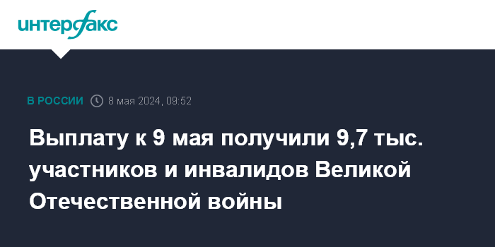 "Социальный фонд России обеспечил выплату участникам и инвалидам Великой Отечественной войны, приуроченную ко Дню Победы. Праздничные надбавки получили 9,7 тыс. ветеранов, проживающих в России и Прибалтике", - говорится в сообщении.