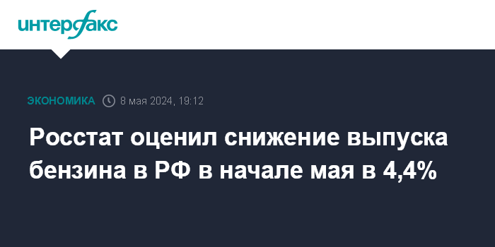 Москва. 8 мая. INTERFAX.RU - Выпуск автомобильного бензина в РФ с 29 апреля по 5 мая снизился на 4,4% к предыдущей неделе и составил 780,6 тыс. тонн, сообщает Росстат.
