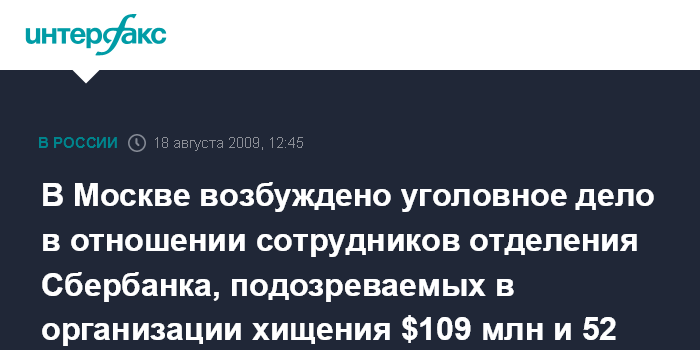 Москва. 18 августа. INTERFAX.RU - Сотрудники одного из отделений Сбербанка подозреваются в организации незаконного получения и хищения $109 млн и 52 млн евро.
