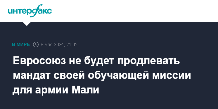 Москва. 8 мая. INTERFAX.RU - Государства-члены Евросоюза приняли решение не продлевать мандат миссии военного обучения EUTM Мали (European Union Training Mission Mali) после 18 мая 2024 года, сообщила в среду Европейская внешнеполитическая служба (ЕВС).