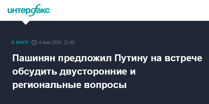 Москва. 8 мая. INTERFAX.RU - Премьер-министр Армении Никол Пашинян на встрече с президентом России Владимиром Путиным в среду в Москве предложил обсудить двусторонние и региональные вопросы.