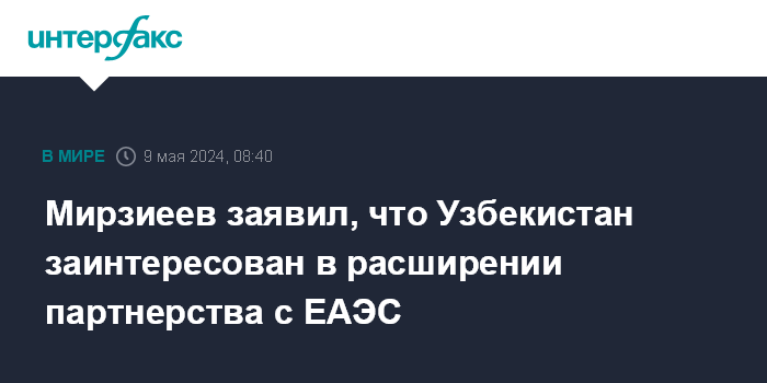 Москва. 9 мая. INTERFAX.RU - Президент Узбекистана Шавкат Мирзиеев, выступая на заседании Высшего Евразийского экономического совета, заявил о заинтересованности в расширении практического партнерства с ЕАЭС и предложил подготовить новый план совместных мероприятий правительства республики и Евразийской экономической комиссии (ЕЭК).