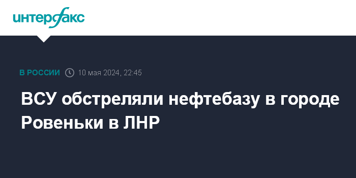 Москва. 10 мая. INTERFAX.RU - Район нефтебазы в городе Ровеньки Луганской народной республики подвергся обстрелу со стороны украинской армии, сообщает "Луганский информационный центр" (ЛИЦ) со ссылкой на очевидцев.