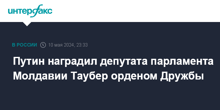 Москва. 10 мая. INTERFAX.RU - Президент России Владимир Путин наградил орденом Дружбы депутата парламента Молдавии Марину Таубер.