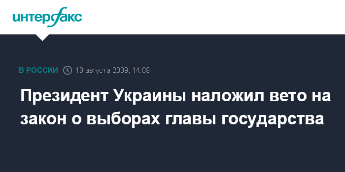 Москва. 18 августа. INTERFAX.RU - Порезидент Украины Виктор Ющенко вернул в Верховную Раду закон о выборах главы государства.Как сообщила замститель главы секретариата главы государства на брифинге во вторник в Киеве, Ющенко возвратил на рассмотрение парламента этот закон со своими замечаниями.