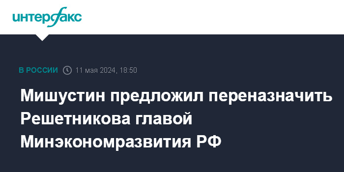 Москва. 11 мая. INTERFAX.RU - Председатель правительства РФ Михаил Мишустин предложил переназначить Максима Решетникова главой Минэкономразвития России.