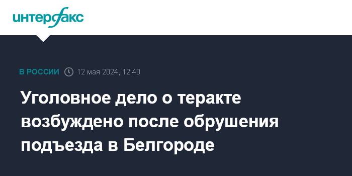 Москва. 12 мая. INTERFAX.RU - Следователи возбудили дело о теракте по факту обрушения секции дома в Белгороде в результате обстрела в воскресенье, сообщил СК РФ.