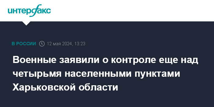 Москва. 12 мая. INTERFAX.RU - Министерство обороны России сообщило, что российские войска взяли под контроль еще четыре населенных пункта в Харьковской области.