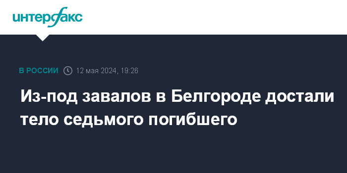 Москва. 12 мая. INTERFAX.RU - В Белгороде спасатели извлекли седьмого погибшего из-под завалов обрушившегося подъезда, сообщает в воскресенье МЧС России.