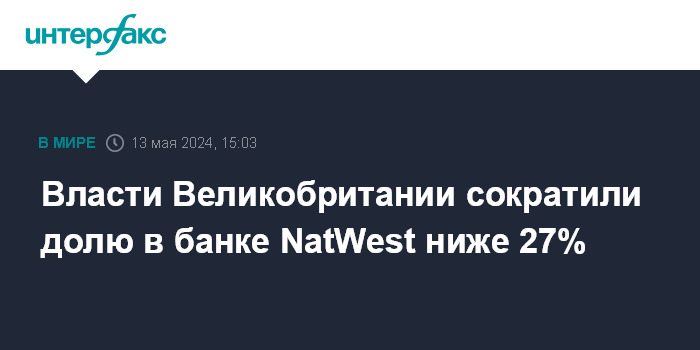 Москва. 13 мая. INTERFAX.RU - Правительство Великобритании за счет продажи акций NatWest (бывший Royal Bank of Scotland) сократило свою долю в банке до 26,95% с 27,93%.