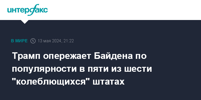 Москва. 13 мая. INTERFAX.RU - Бывший президент США Дональд Трамп опережает по популярности нынешнего главу государства Джо Байдена в пяти из шести ключевых для победы на выборах 2024 года штатах, свидетельствует опрос для издания The New York Times.