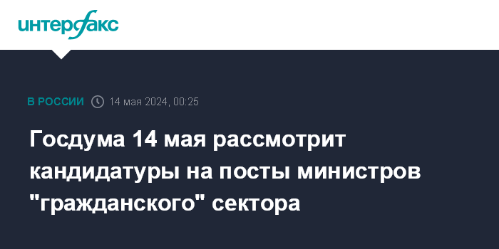 Госдума 14 мая рассмотрит кандидатуры на посты министров "гражданского" сектора