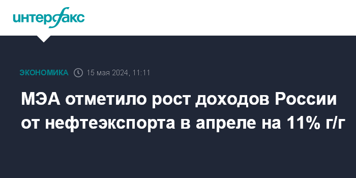 Москва. 15 мая. INTERFAX.RU - Российский нефтяной экспорт в апреле сократился в годовом измерении на 800 тысяч б/с (на 9,9%), а доходы при этом оказались на $1,7 млрд выше (на 11%), чем в апреле 2023 года, говорится в ежемесячном отчете МЭА.