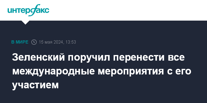 Москва. 15 мая. INTERFAX.RU - Президент Украины Владимир Зеленский написал в социальных сетях, что поручил перенести все международные мероприятия со своим участием.