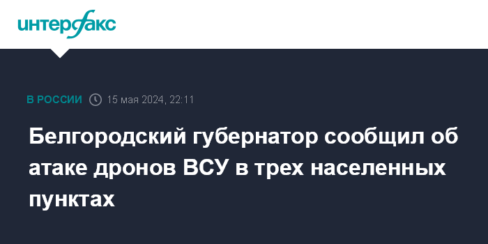 Москва. 15 мая. INTERFAX.RU - Три населенных пункта в Белгородской области подверглись атаке украинских беспилотников ВСУ, сообщил глава региона Вячеслав Гладков в среду.