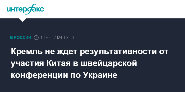 Москва. 16 мая. INTERFAX.RU - Участие Китая в конференции по Украине в Швейцарии не добавит результативности этому мероприятию, заявил "Известиям" пресс-секретарь президента России Дмитрий Песков.