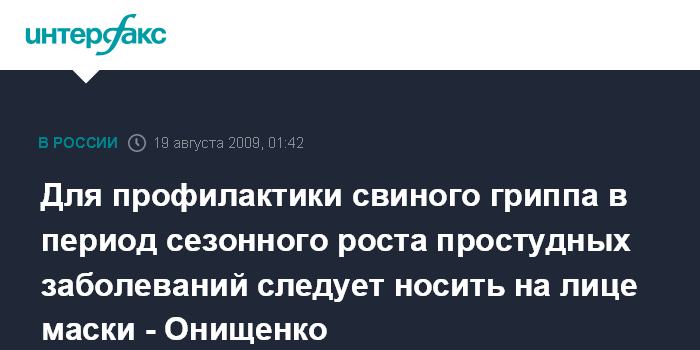 Москва. 19 августа. ИНТЕРФАКС - Глава Роспотребнадзора, главный государственный санитарный врач РФ Геннадий Онищенко советует россиянам следовать зарубежному опыту и носить на лице маски в период сезонного роста простудных заболеваний для профилактики свиного гриппа.