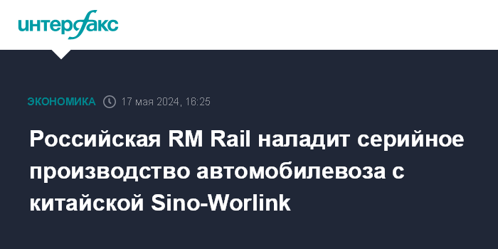 Москва. 17 мая. INTERFAX.RU - Компания "РМ Рейл" (RM Rail) изготовила опытный образец вагона для перевозки автомобилей по заказу китайской автомобильной компании Sino-Worlink International Supply Chain Management, в мае представит его заказчику, сообщает RM Rail.