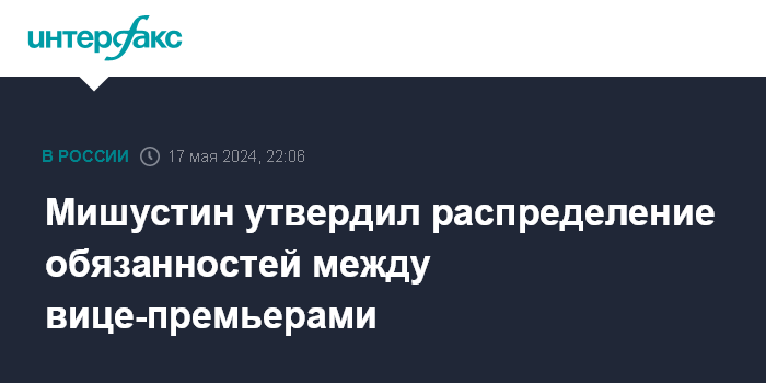 Москва. 17 мая. INTERFAX.RU - Премьер-министр Михаил Мишустин утвердил распределение обязанностей между своими заместителями, сообщает сайт правительства.