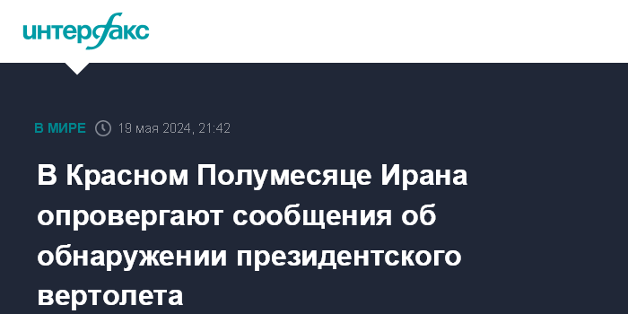 Москва. 19 мая. INTERFAX.RU - В Обществе Красного Полумесяца Ирана, входящем в состав Международного Красного Креста, заявили, что сообщения об обнаружении вертолета, на борту которого находился президент Ибрахим Раиси, не соответствуют действительности, передает телеканал Press-TV.