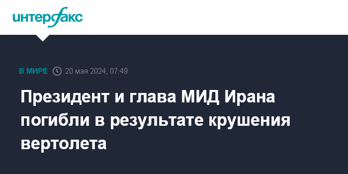 Москва. 20 мая. INTERFAX.RU - Президент Ирана Ибрахим Раиси и министр иностранных дел страны Хосейн Амир Абдоллахиан погибли в результате крушения вертолета в воскресенье, сообщило иранское информагентство Mehr.