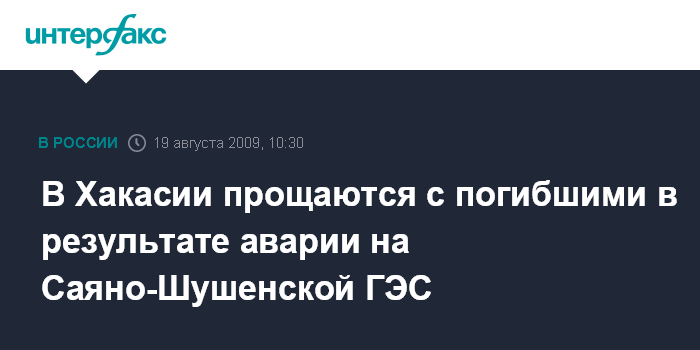 Москва. 19 августа. INTERFAX.RU – В поселке Черемушки и Саяногорске в среду проходят похороны четырех сотрудников Саяно-Шушенской ГЭС, погибших в результате аварии, передает корреспондент "Интерфакса".