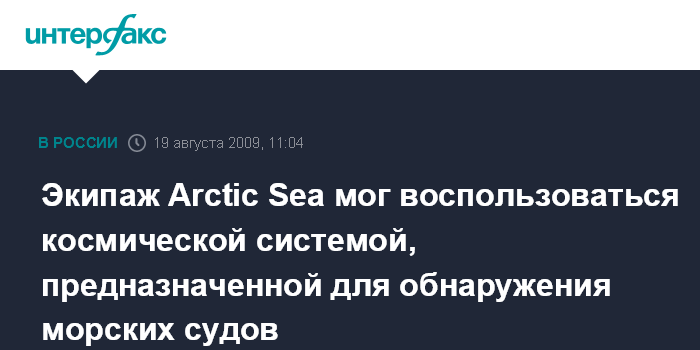 Москва. 19 августа. INTERFAX.RU – Экипаж лесовоза Arctic Sea по какой-то причине не воспользовался возможностями глобальной космической системы КОСПАС/САРСАТ, предназначенной для оказания помощи морским судам, терпящим бедствие, заявил "Интерфаксу-АВН" генеральный директор - генеральный конструктор Российского НИИ космического приборостроения Юрий Урличич.